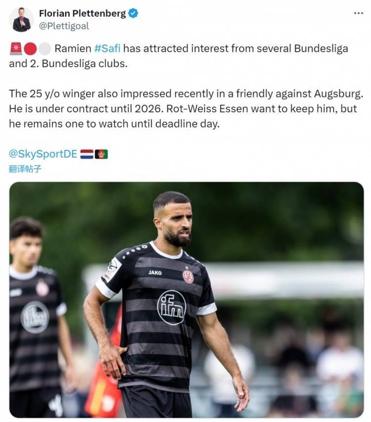 直播吧7月29日讯 据德国天空体育报道,德丙25岁边锋萨菲吸引了多家德甲、德乙俱乐部的兴趣。媒体指出,多家德甲、德乙俱乐部对红白埃森边锋萨菲感兴趣,这位25岁的球员在对阵奥格斯堡的友谊赛中表现出色。萨菲与红白埃森的合同2026年到期,俱乐部希望留住他,萨菲今夏的动态值得关注。萨菲上赛季出战44场比赛9球6助,德转身价30万欧元。